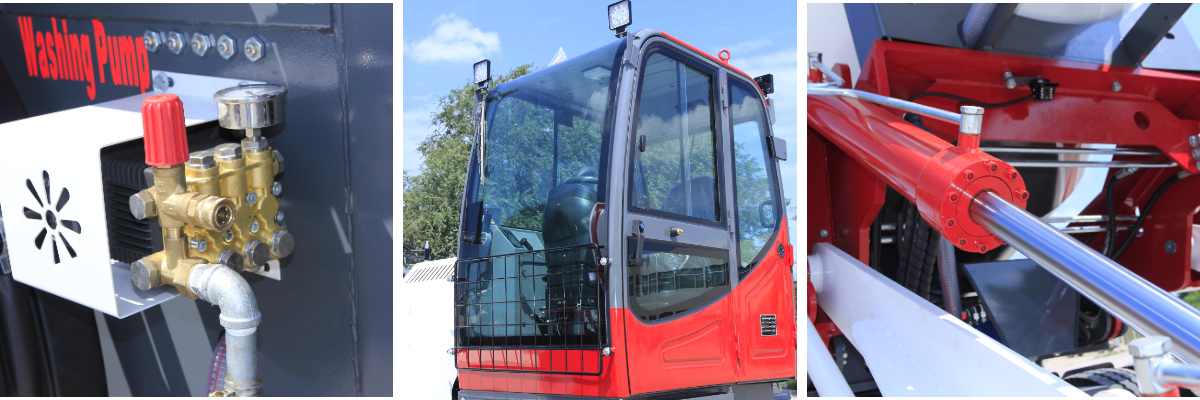 Он также имеет ряд удобных для оператора конструкций. Просторная и комфортная кабина оснащена встроенной панелью управления, которая проста и удобна в использовании. Весь процесс загрузки, смешивания и разгрузки может выполнить один человек, что значительно повышает эффективность строительства. Кроме того, машина оснащена внешним всасывающим насосом и гидравлической системой вращения, что дополнительно повышает удобство и гибкость эксплуатации.