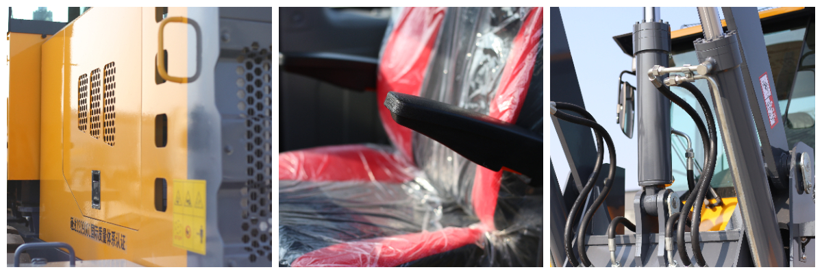 Машина оснащена комплексными системами безопасности: гидравлические дисковые рабочие тормоза (с суппортами на обеих осях) и механические барабанные/стояночные дисковые тормоза обеспечивают безопасность эксплуатации. Открытая гидравлическая система (объем: 40 л) имеет максимальное рабочее давление 16 МПа, а шестеренчатый насос обеспечивает стабильную мощность. Джойстиковое управление обеспечивает точность и удобство работы.